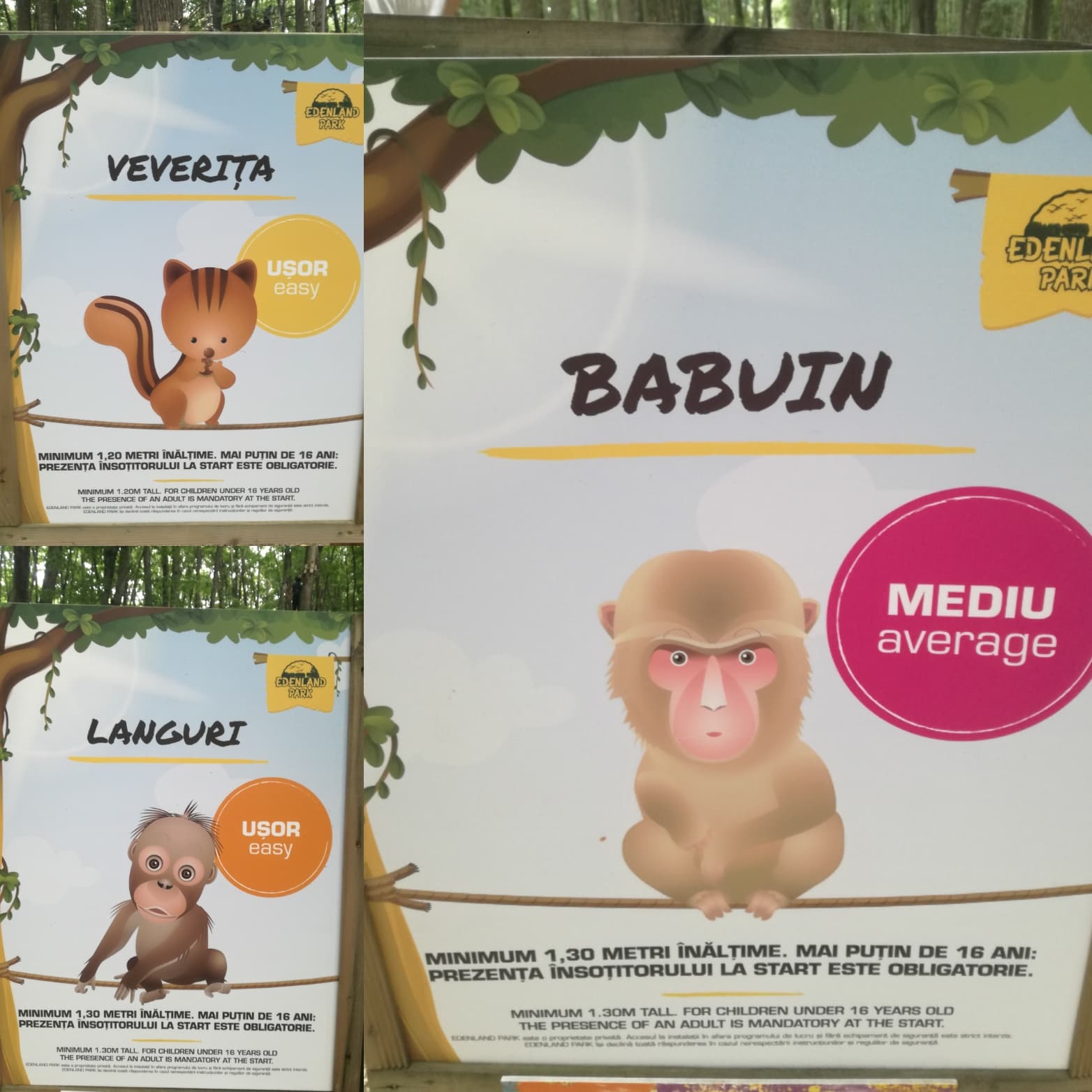 Copiii pot sa verifice singuri daca pot incepe sau nu un traseu, masurandu-se. Ana si Stefan au putut sa experimenteze doar 3 trasee, exceptandu-le pe cele pentru copiii foarte mici, tinand cont de inaltimea lor, pana in 130 cm, si anume Veverita, Languri si Babuin. Au fost foarte curajosi, si-au invins frici (Stefan de a merge pe franghie) si s-au ajutat reciproc pe tot parcursul traseelor, Anei fiindu-i mai greu sa manuiasca Zaza si carabina pentru tiroliana.